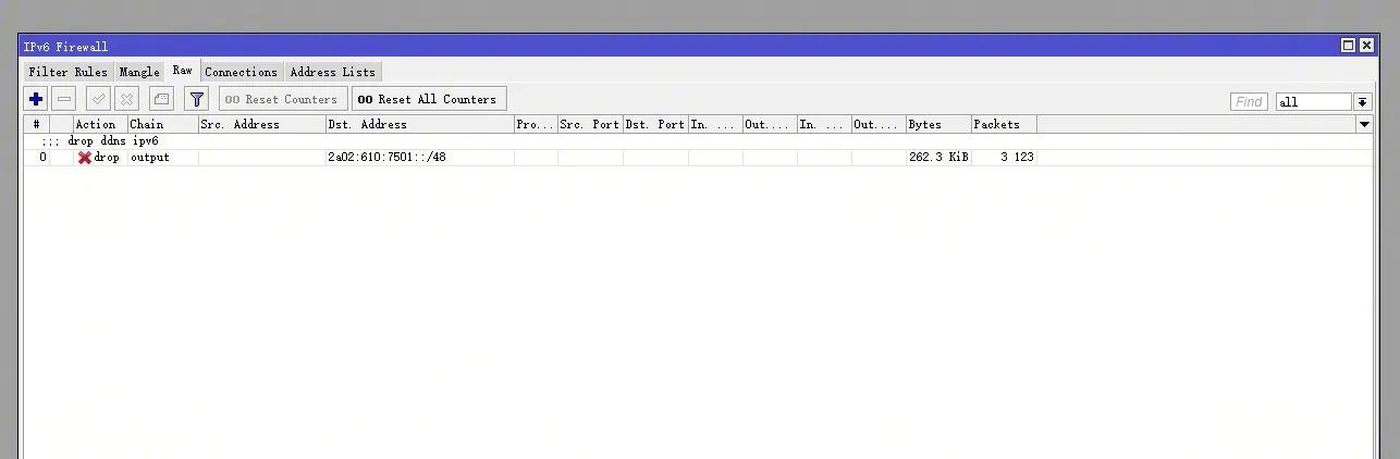 操作很简单,只要使用 WinBox 登录 RouteOS,选择 IPv6->Firewall 选项卡,选择 Raw 标签,点击+号新增一个条目。General 标签页中 Chain 表选择 output,dst.Address 填写 2a02:610:7501::/48,切换到 Action 标签页,选择 Action 为 drop。