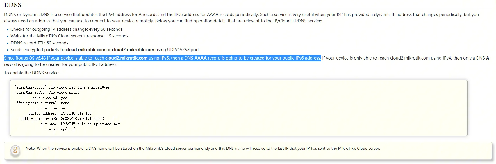 目前看来 RouteOS 没有提供更多关于 Cloud 功能的选项,我们查阅了一下 RouteOS 的 Wiki 关于 Cloud 服务的部分内容,这里的一句话引起了我们的关注。