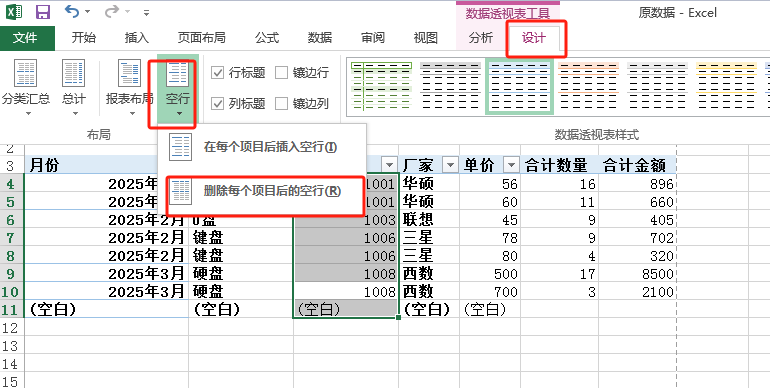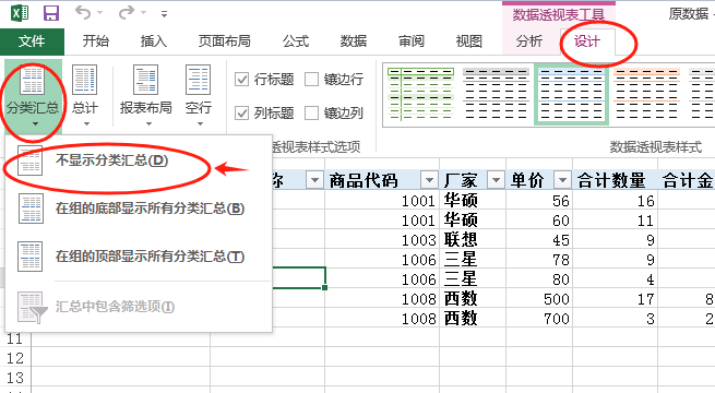 设计选项卡 → 分类汇总 → 不显示分类汇总