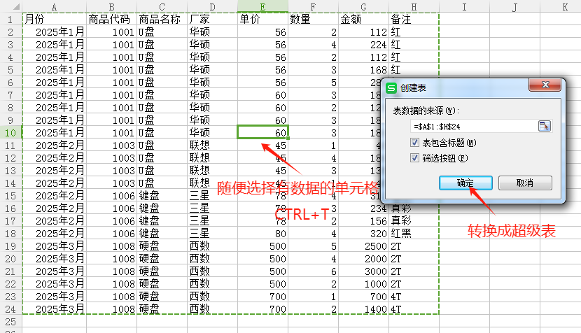 1、【这步骤是可选的,不操作也可以】:打开原数据表——随便选择有数字的单元格(不能选中文字符的),或手工选择所有数据——CTRL+T转换成超级数据表